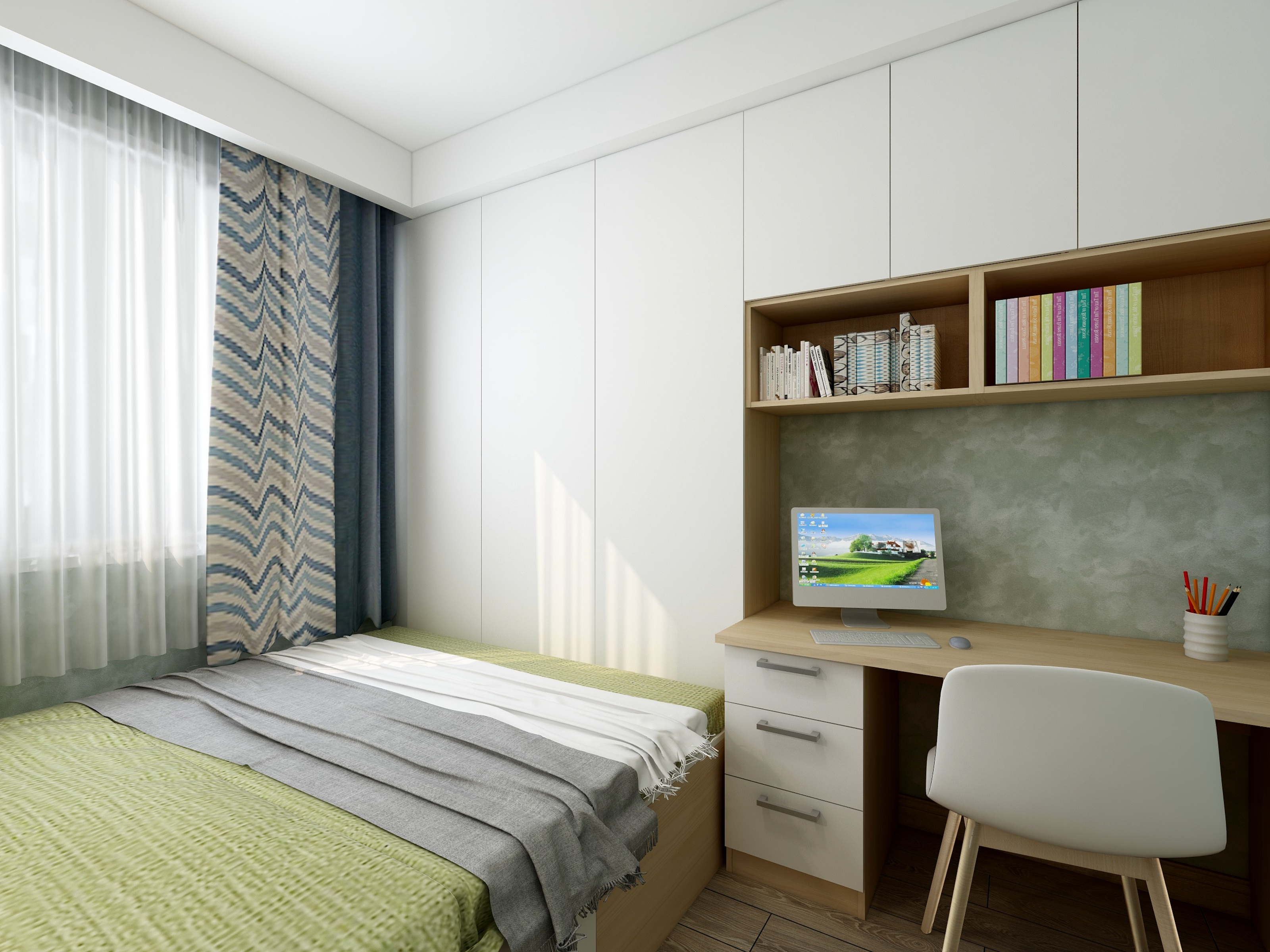 采用了淺綠色的床單和藍(lán)色條紋窗簾作為點(diǎn)綴,輕快、自然,符合小孩子活潑的、歡快的性格。